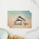 Une carte de remerciements au style extérieur minimaliste. Conçu avec une illustration d'une montagne avec des rayons de soleil venant de l'arrière. Le mot "merci" écrit ci-dessous. Arrière - plan est une couleur parchemin avec une pointe de bleu.