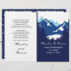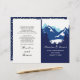 Montagnes bleues et conifères plié programme de mariage. Un design de mariage à la fois tendance et élégant, avec une chaîne de montagnes à travers les conifères et vos noms dans le style manuscrit. L'intérieur comprend des bordures bleues et blanches avec des cadres pois et blancs avec votre texte.