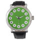 Une face d'horloge élégante avec les nombres placés à l'intérieur des taches de couleur circulaire dans chaque position horaire. Aussi disponible en d'autres couleurs.