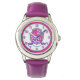 Aimee nom de ligne unique signifiant chevaliers heraldry bouclier enfants montre poignet. Bouclier style Chevalier lettre monogramme Un nom d'art simple visage à horloge numérotée parfait pour dans les tons de violet, rose chaud, blanc et gris. Personnalisez avec votre propre nom et nom signifiant pour un grand cadeau personnalisé unique, cet exemple est pour les noms avec la lettre A et lit actuellement Aimee beauté bien-aimée. Autres éléments et noms correspondants disponibles. Dessin de bouclier unique, art graphique, recherche de nom, rédaction et design par Sarah Trett. www.sarahtrett.com pour www.mylittleeden.com