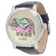 C'est une montre à thème éléphant vraiment facile à customiser, pour ce modèle il suffit d'ajouter le nom. Il s'agit d'un grand cadeau personnalisé pour les anniversaires, la remise des diplômes, Noël, vacances, comme un cadeau d'appréciation, et pour toute occasion spéciale en général. Eléments sur la composition du design, éléphant, couleurs vert, rose, bleu, turquoise et marron, et lettrage typographie.