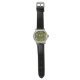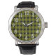 Cette montre pour hommes a un design moderne du milieu du siècle de diamants noirs solides à l'intérieur des contours de diamants noirs sur un champ de vert.