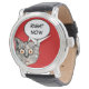 Un drôle de visage de chat de dessin animé avec un ballon de discours disant 'DROIT MAINTENANT'. La couleur arrière - plan rouge peut être modifiée ('customiser,'modifier')