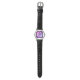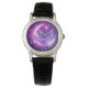 Une chauve-souris violette portant un casquette de sorcière vole devant une lune brillante de croissant aux étoiles brillantes qui l'entoure.
