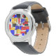 Cette montre a une conception Bauhaus de rectangles et de carrés avec des lignes noires traversant la conception sur un champ de blanc.
