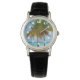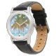 Une montre avec une belle photo tranquille de 2 palmiers sous un ciel bleu vif. Situé sur une plage tropicale isolée avec une eau turquoise et calme.