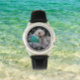 Montre élégante avec des chiffres blancs qui présente l'image photo d'une paire de loutres de mer mignonnes jouant avec un jouet à bille. Sélectionnez votre montre dans plusieurs styles.