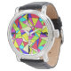 Éclaircissez le temps à raconter avec cette montre de déclaration extraordinaire ! Je regardais Bauhaus suivi de Mondrian, et c'est arrivé. Oups ! Un mur de jolis triangles multicolores en font un garde-temps étonnant.