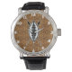 Cette montre présente un Bouclier africain et des lances croisées sur un arrière - plan en bois simulé avec un motif tribal. Grande tenue de poignet distinctif pour toute occasion!