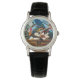 Calico cat jouant avec un dragon chinois rouge devant un vitrail de paon.