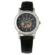 Une montre avec une jolie illustration. Un chat noir aux cheveux longs portant un casquette de sorcière noire. C'est des oreilles qui s'arrachent. Entouré de fleurs d'automne orange et marron. Un design génial pour les objets à thème sorcier et Halloween.