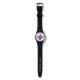 Une montre avec une amusante illustration thématique Halloween pour les amoureux de les chats. Un gros chat noir aux yeux vêtu d'un grand casquette de sorcière noire avec une ceinture rose violet autour du bord.