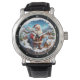 This vibrant watch face features a cheerful Santa Claus, giving a hearty thumbs-up in a picturesque snowy village. Cozy cottages with warm lights nestle among frosted pine trees, all set against a beautiful mountain backdrop under a bright sky. This artistic timepiece perfectly captures the joyous spirit of Christmas, making it a delightful decorative addition.