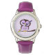 La montre élégante personnalisée présente une illustration vectorielle douce d'un hibou perché sur une branche d'arbre sur un arrière - plan motif pois. Babystar Design à l'adresse mygrafico.com