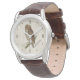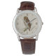 Montre à poignet d'inspiration nature, avec l'art vintage d'une chouette sur une branche, contre un arrière - plan en bois clair. Personnalisez le nom selon vos besoins. Idée cadeau pour tous les amoureux des oiseaux.
