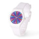 A vibrant bold colorful multicolored sun burst style graphic decor on a fine custom fashion watch. Customize the product further with some text by clicking on the "CUSTOMIZE IT!" button or link. This veut reveal a set of designing tools, a text editor where you can add text, choose color, and font style.