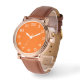 Montre Vintage Rose or pour hommes avec bracelet en cuir Brown, avec des chiffres arabes blancs en gras contre un arrière - plan orange néon. Cette montre est personnalisable avec vos propres textes ou images. La couleur vive est souvent associée au signe du zodiaque de Leo, ce qui en fait un choix judicieux pour lui.