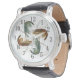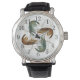 Montre avec un design de quatre crevettes sur le cadran. Fond blanc et chiffres autour en noir, les crevettes sont de couleurs vertes et brunes et ont de longues antennes ondulées qui ajoutent de l'intérêt au design. Fabriqué comme une montre pour hommes, et est parfait pour un pêcheur en mer, ou propriétaire de magasin d'appâts, mais convient également aux femmes ou aux enfants.