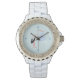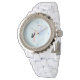 Cette montre impressionnante présente une image graphique d'une mignonne cigogne blanche avec des plumes de queue noire qui se tiennent sur un paquet de couvertures bleu pâle. Il y a du texte bleu sur le paquet qui dit "Baby Boy". Ce design est parfait pour célébrer un bébé garçon.