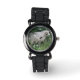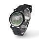 Cette belle montre présente une photo d'un mignon mouton moelleux. Le mouton est entouré de fleurs sauvages et d'herbe longue et il mange avidement quelques feuilles. Il a une épaisse couche blanche de laine et un mignon nez noir.