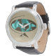 Voyagez autour du monde avec cette montre moderne du monde du milieu du siècle. Le design présente un globe ovale abstrait avec des continents à grains de bois. Les océans sont dans les tons turquoises et turquoise. Le globe est sur un socle en bois triangulaire et le monde entier est sur un arrière - plan de couleur blé.