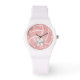 Cette montre de volley-ball sportive présente un graphique minimaliste de volley-ball (représenté uniquement par les coutures de volley-ball en blanc) surplombant une texture rose, chic, numériquement créée - personnaliser avec son nom et son numéro de monogramme ou de maillot - par katz_d_zynes