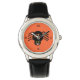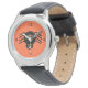 Cette belle montre présente une araignée noire éffrayante avec huit jambes poilues, des yeux jaunes avec de grands élèves noirs et sa bouche ouverte montrant ses crocs. Il y a un texte orange qui dit "Happy Halloween" et un arrière - plan orange correspondant.