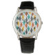 Cette montre pour hommes a un design moderne du milieu du siècle de diamants en orange, jaune, turquoise, gris, et dessiné éparpillé sur un champ de blanc.