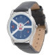 Montre avec le drapeau de la ville de Fort Wayne, Indiana; drapeau bleu et blanc et avec le blockhouse rouge au centre et trois illustrations dans le champ bleu - illustration de la tête des Amérindiens, fleur de lys français et lion britannique