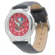 Un clown de tronçonneuse sur une montre. Utilisez "Personnalisez ce modèle" pour modifier le texte "IT'S CHOPPING TIME!" et créer un cadeau unique et customisé. avec un clown coloré et maniaque brandissant une tronçonneuse orange, avec des cheveux bleus sauvages et portant un rouff, des chaussures clowns massives et des leggings et manches rayés.