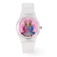 Drôle joli lapin lapin lapin personnages en robe sur un vintage damassé rose, arrière - plan, par Oconnart. Supprimez les nombres / chiffres si vous le souhaitez, vous pouvez personnaliser ce design en choisissant parmi un large choix de styles de montre et de couleurs de sangle. Visitez le MAGASIN VINTAGEPRINTS pour apparier des dessins animaliers amusants et mignons.