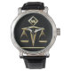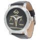 Montre à bracelet obligatoire avec scales de justice d'inspiration Art Déco dressées contre un arrière - plan noir avec champ de texte personnalisé pour votre monogramme à 12h00. Ensemble avec cet élégant bracelet en cuir noir vintage et lunette en métal noir, il est parfait pour l'avocat, juge, étudiant en droit, parajuriste, etc dans votre vie!