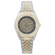 Cette montre élégante est dotée d'un motif central à clé grecque qui donne une impression abstraite au design. Un cadre en cercle doré sépare le motif des chiffres et des diamants qui facilitent la lecture de la montre. Tout est placé sur un arrière - plan noir dramatique.