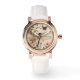 Belle montre pour femmes avec une jolie libellule, roses roses roses, belles perles blanches et rouges, bordure en figuier doré et papillon noir et orange.