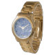 Cette montre unique est pour les femmes. C'est de l'or avec un visage psychédélique bleu. Le design vient d'un carrelage artisanal. Les chiffres sont faciles à lire. Ceci est du fabricant de tuiles de l'Oregon Fay Jones Day.