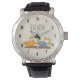 Une montre au design mignon avec 4 dinosaures. 2 volent et 2 sont au sol. Créé avec des aquarelles.