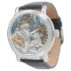 A beautifully crafted watch features Santa Claus dressed in ornate gold and white robes, seated beside a serene reindeer.