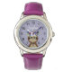 Cette jeune fille moderne et fillette montre une belle caricature en paresse peinte à la main avec une magnifique couronne de fleurs dans ses cheveux, sur un mignon arrière - plan violet. Cette montre à l'aquarelle fleurie en parfum dispose également d'un endroit où vous pouvez ajouter le nom de votre fille dans une typographie élégante. Le design faunique parfait pour la première montre d'un enfant !