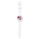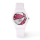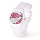 Cette montre de basketball sporty personnalisée présente l'image réaliste d'un basketball qui a recoloré alternant des panneaux rose et blanc, sur lesquels vous pouvez facilement customiser le nom de l'athlète dans une police de signature (ou autographe) au-dessus du numéro de maillot du joueur (dans une police de style lettre variable), et des chiffres de visage de l'horloge blanche - par katz_d_zynes