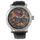 This close-up image features a unique watch face with a vibrant, action-packed illustration. A custom trike, engulfed in vivid orange and yellow flames, dominates the design. The dark background accentuates the fiery motif, while silver numbers and watch hands maintain functionality, creating a bold and energetic accessory for motorcycle enthusiasts.