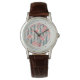 Une montre avec une belle motif aux jolies fleurs roses posée sur un motif rayé composé de rayures bleues et crème.