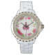 Une montre pour les enseignants avec le logo de The Pink Schoolhouse au centre avec une bordure rose fleurie. Personnalisez avec votre nom sous la maison de classe. Les chiffres sont roses et verts.