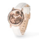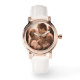 Cette belle montre a une face / cadre or rose et bande blanche. Ajoutez votre photo spéciale et personnalisez-la avec du texte manuscrit, en bas. Exemple de libellé : "Notre amour est éternel", ou changer. Cette montre féminine fait un joli cadeau pour une femme ou une petite amie. Votre photo aura une teinte rose à cause du filtre choisi. Pour changer cela, utilisez l'outil de conception. Choisissez la photo, sur la page de l'outil de conception, puis "filtres". Changez-le en aucun filtre. C'est l'un des nombreux styles de montre-bracelet. Le design est facile à échanger contre n'importe quel autre style.