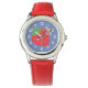 Belle fraise de dessin animé avec visage souriant sur la montre enfant personnalisée bleue et rouge avec des chiffres faciles à lire.