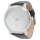 Front and back views of a wristwatch with a patterned white face and black leather strap. The watch has a sleek silver casing, conveying elegance.