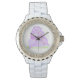 Un design élégant avec un gâteau violet à trois niveaux avec des rubans et des accents floraux.