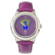Cette superbe montre est ornée d'un paon de Noël brillant et audacieux portant un chapeau de Père Noël. L'oiseau a un ventre bleu vif avec une belle collection de plumes tendues fièrement derrière. Les oeillères sont bleues, brunes et vertes. Le Peacock a de grands yeux noirs et un mignon petit bec gris.