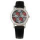 Regardez dans un motif classique de kimono japonais de grues stylisées, disposées dans un motif d'hexagones, en rouge profond, gris clair et moyen, sur fond noir