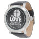 An impactful art piece featuring the words HIS LOVE ENDURES FOREVER in white lettering on a black background, accompanied by a cross and Psalm 136:1. The design includes a bold white cross within a circular emblem, emphasizing the spiritual message. A powerful item perfect for expressing faith and devotion.