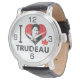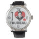 Je Coeur Trudeau. J'Aime Justin Trudeau. Avec une feuille d'érable canadienne rouge. Premier ministre libéral du Canada. Le visage de Justin fait comme illustration graphique et finit dans un regard grinçant et affligé. Avec des chiffres noirs.